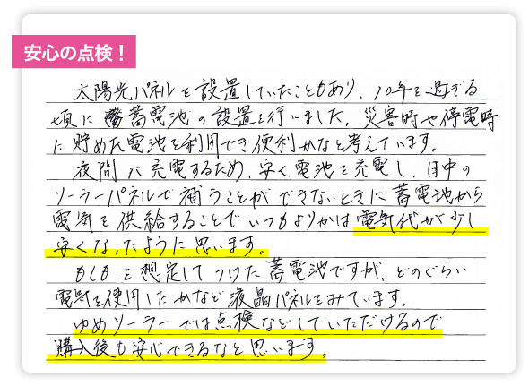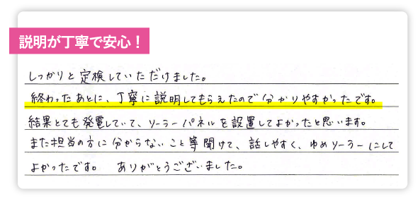 「ゆめソーラーで設置してよかった」 と言っていただけるよう、機器の点検や発電量のチェックなど、お客様の不安を解消するアフターサポートにも力を入れています。